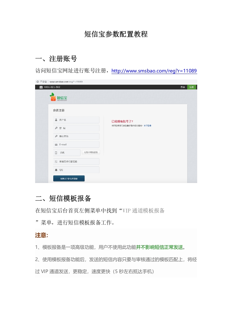 短信宝参数配置教程一、注册账号访问短信宝网址进行账号注册,htp/www.smsbao.com/reg?r=11089霜4001-021-502会员注册已经拥有账号了?E-Imail口三机二、短信模板报备在短信宝后台首页左侧菜单中找到“VIP通道模板报备”菜单,进行短信模板报备工作。注意:1、模板报备是一项高级功能,用户不使用此功能并不影响短信正常发送。2、使用模板报备功能后,发送的短信内容只要与审核通过的模板匹配上,将经过VMP通道发送,更稳定,速度更快(5秒左右抵达手机)3、一条正规的短信包括签名和正文两部分,如“【糖果说】您正在注册糖果说,验证码是:{code},该验证码5分钟内有效。”其中糖果说就是签名,后面的部分就是正文。此处使用“{code}”表示验证码变量,用户收到的短信内容中,该变量会被替换成随机生成的数字验证码。仅支持使用这一个验证码变量!4、用户可以通过申请新模板申请,一般工作时间内当天即生效。5、模板报备后,系统并不会修改你的短信内容,也不会自动加上签名,只是起到匹配审核的作用。所以您在提交短信发送时,还必须按照模板报备的完整内容(包括签名)提交短信。短信短信发送统计후20190506-2C三、插件设置访问插件后台设置页面,如下:阿里云短信手机登录短信发送测试短信发送记录统一用户手机绑定管理。插件阿里云短信手机登录[短信宝短信宝注册地址:htp/www.smsba短信宝官方客服,享受如下优惠政策:短信宝平台帐号:比处填写短信宝平台登录账号佣户名短信宝平台密码此处填写短信宝平台账号登录密码统一用户手机绑定表:如果统一了用户于机绑定表,那么登录用于兼容其他于机短信插件,同时防止开启注册短信验证码发送开启注册短信险证码发送能,涉及电服插件设置中“短信宝平台账号”、“短信宝平台密码”参数,分别填写用于登录短信宝网站的账户,和密码。插件有四组填写签名和短信模板的地方,区分短信内容就分开填写,
