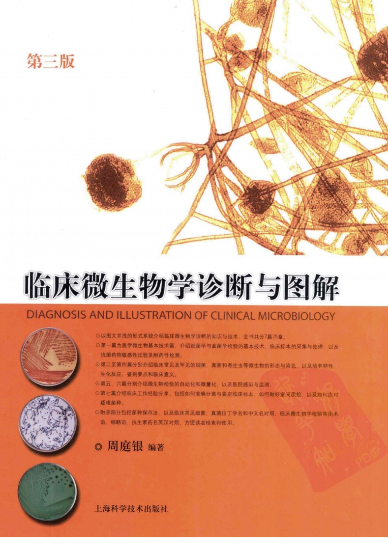 第三版临床微生物学诊断与图解DIAGNOSIS AND ILLUSTRATION OF CLINICAL MICROBIOLOGY⊙以图文并茂的形式系统介绍临床微生物学诊断的知识与技术,全书共分7篇25章⊙第一篇为医学微生物基本技术篇,介绍细菌学与真菌学检验的基本技术,临床标本的采集与处理,以及抗菌药物敏感性试验及耐药性检测,⊙第二至第四篇分别介绍临床常见及罕见的细菌,真菌和寄生虫等微生物的形态与染色,以及培养特性⊙第五、六篇分别介绍微生物检验的自动化和微量化,以及医院感染与监测。⊙第七篇介绍临床工作经验分享,包括如何准确分离与鉴定临床标本,如何做好室间质控,以及如何应对⊙附录部分包括菌种保存法,以及临床常见细菌.、真菌拉丁学名和中文名对强,临床微生物学检验常用术语、缩略语、抗生素药名英汉对照.方便读者检索和使用。⊙周庭银编著上海科学技术出版社临床微生物学诊断与图解第三版158N978-7-5478-1226-69787547812266>定价:298.00元临床微生物学诊断与图解(第三版)DIAGNOSIS AND ILLUSTRATIONOFCLINICAL MICROBIOLOGY编著周庭银主审倪语星苏建荣PDG上海科学技术出版社